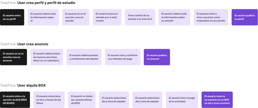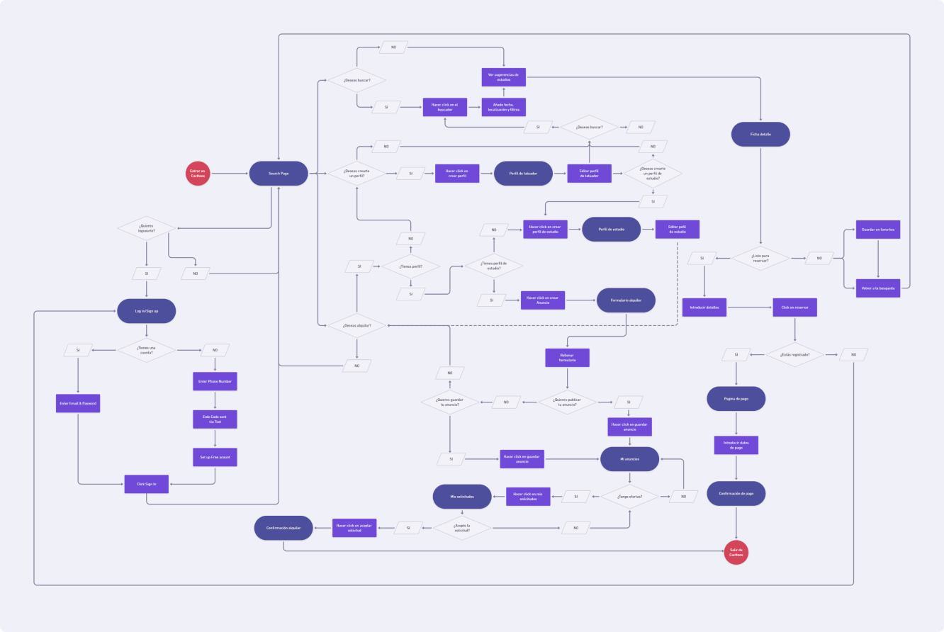 Necesitábamos cambiar por completo el flujo de usuarios, comenzando por eliminar la home explicativa y añadiendo varias funcionalidades de la manera más simple y orgánica posible para el MVP. Creamos un user flow que contemplaba desde el registro hasta la finalización de la reserva.